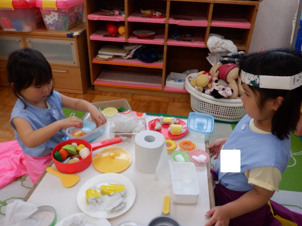 さくら組のお友達は,容器におかずカップを敷き,配置を考えながら,野菜や魚を詰めて,お弁当作りをしています。