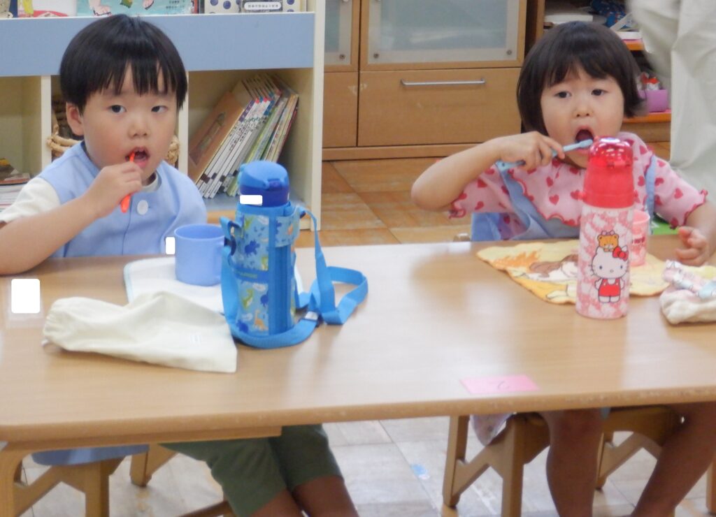 さくら組のお友達は,給食後の歯みがきを始めました。カバさんと一緒に,音楽に合わせて磨きます。