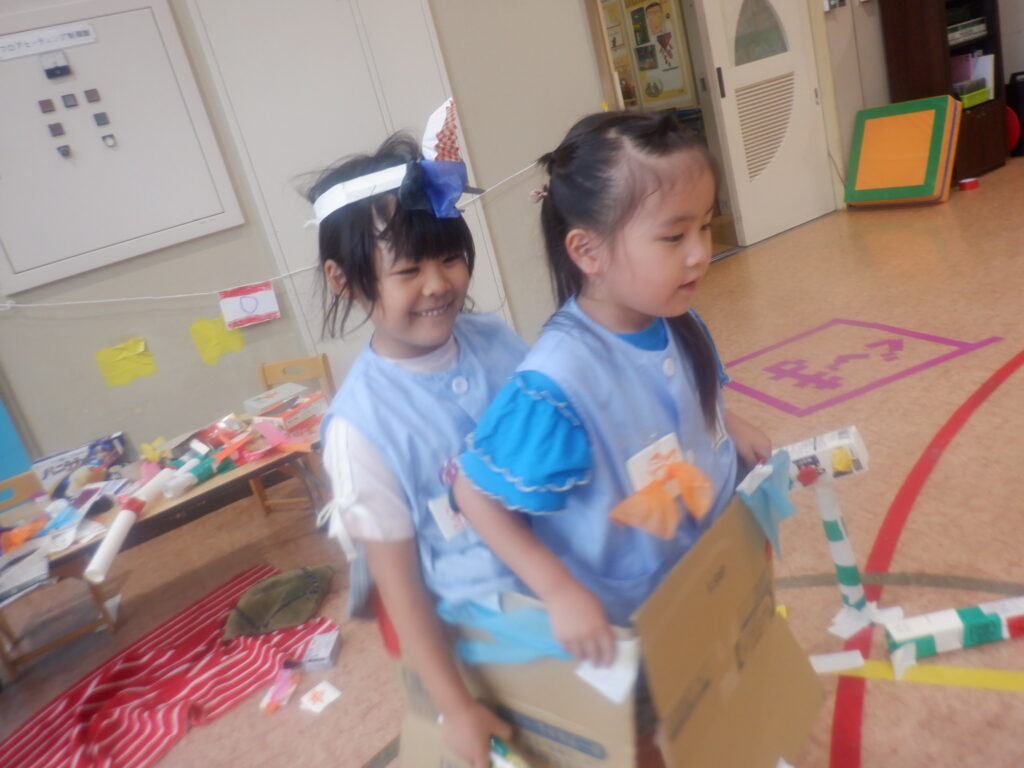 もり組のお友達は,お友達と一緒に乗れる車を作って,まちを走っています。