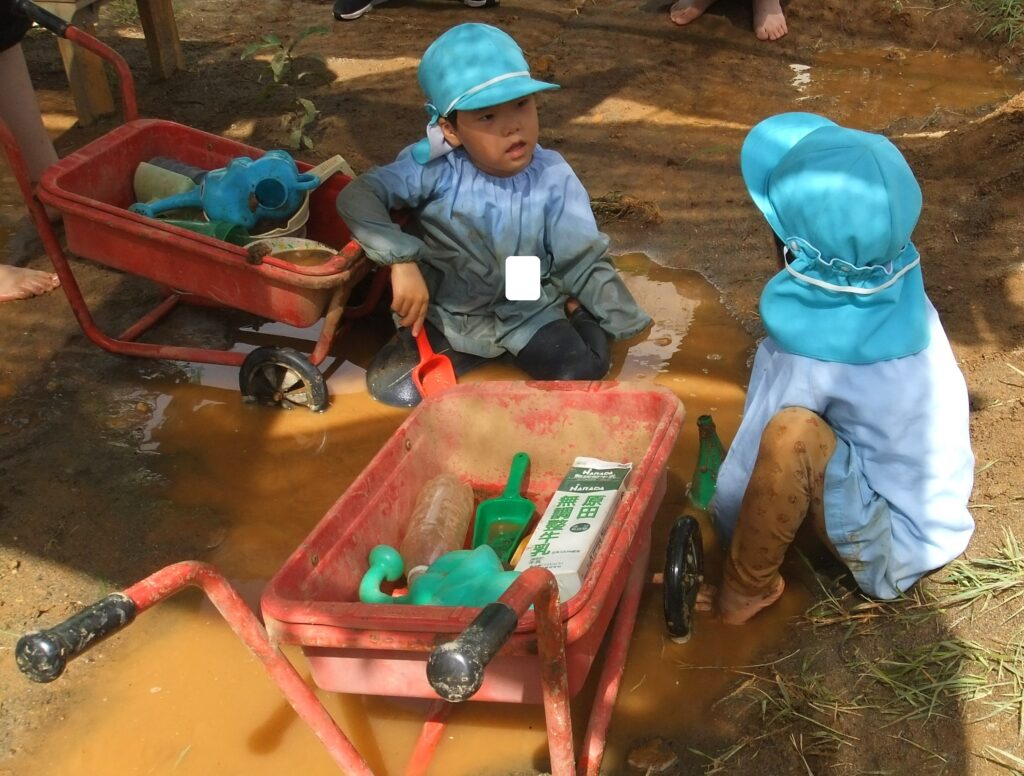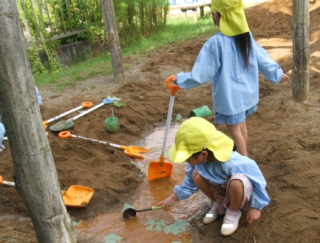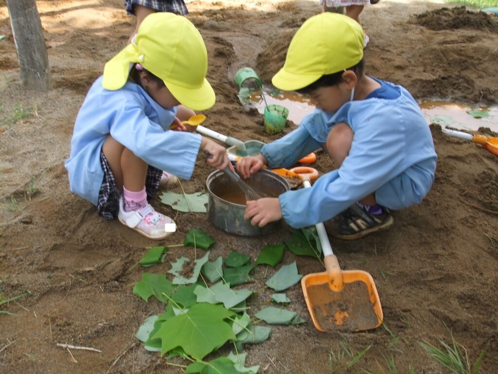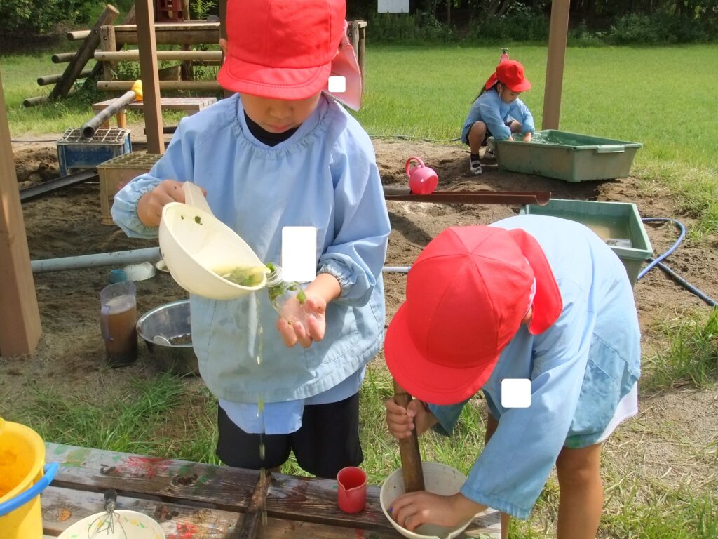 ばら組のお友達は,砂場に水を溜めたところに葉っぱを入れて,お玉でかき混ぜながらスープを作っています。