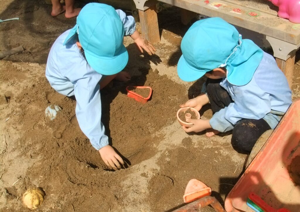 さくら組のお友達は,三角や丸の形の容器に砂を入れて,型抜きをしています。