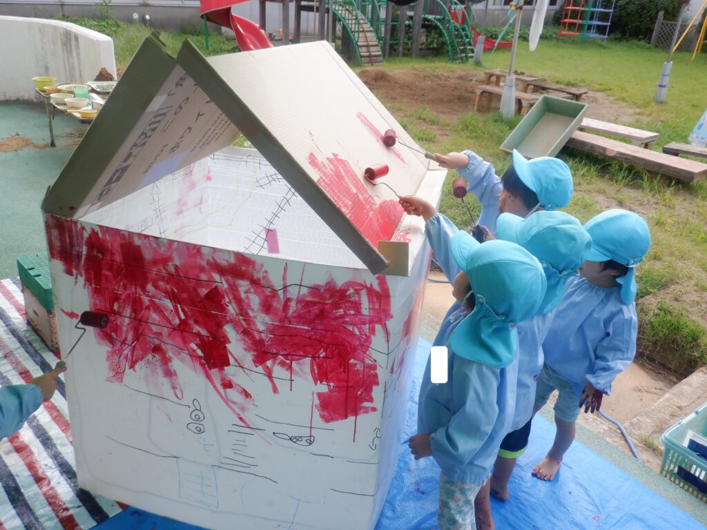 さくら組のお友達は,ダンボールとプラ板で作った家に,絵の具で色を塗っています。