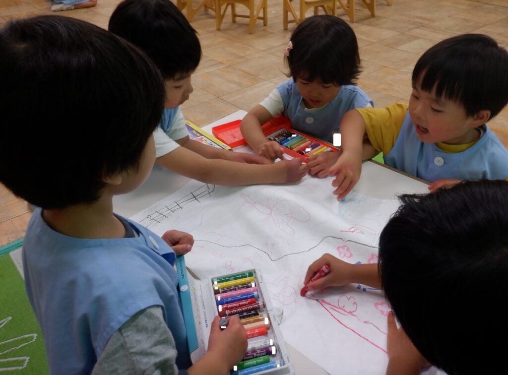 さくら組のお友達は,探検遠足に持っていくさくら組の旗にクレヨンで絵を描いています。