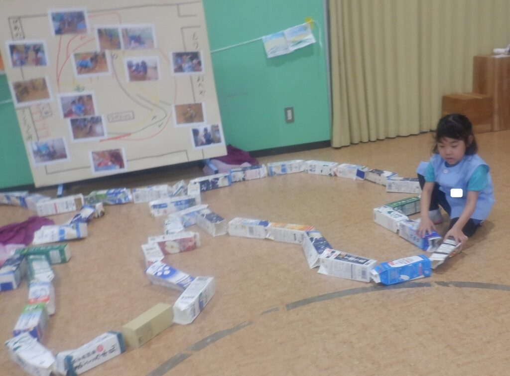 もり組のお友達は,イメージを膨らませながら,牛乳パックを並べて猫のお屋敷を作っています。