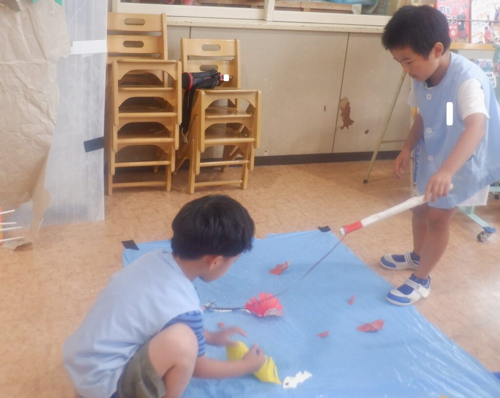 もり組のお友達は,もり組のまちに海ができたので,自分で作った釣りざおで魚釣りをしています。