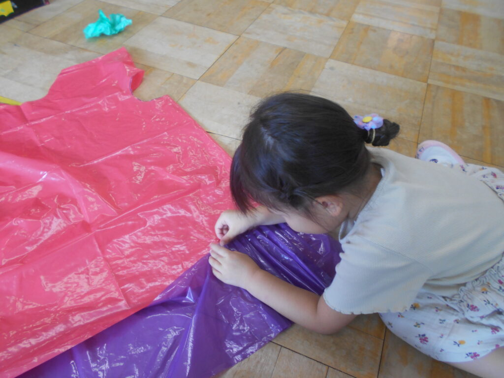 ばら組のお友達は,裾にギャザーが入ったプリンセスのドレスを作りたいと思い,ビニルを少し織り込みながら丁寧にテープでとめています。