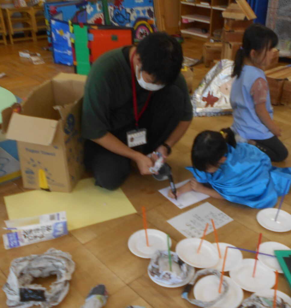 ばら組のお友達は,紙皿やストローなどを組み合わせて,お祭りで使う輪投げを作っています。