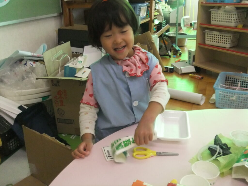 さくら組のお友達は,牛乳パックで作ったレジのバーコードリーダーを使って会計をしています。