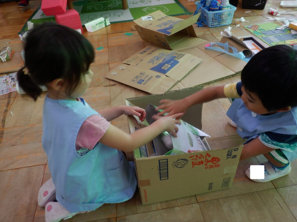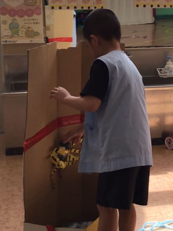さくら組のお友達は,ダンボールや空き箱で作ったコースに,紙コップが転がるかどうか試しています。